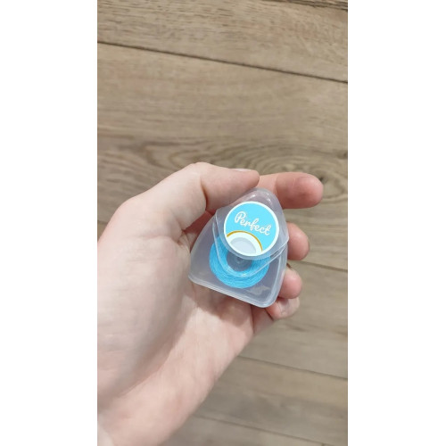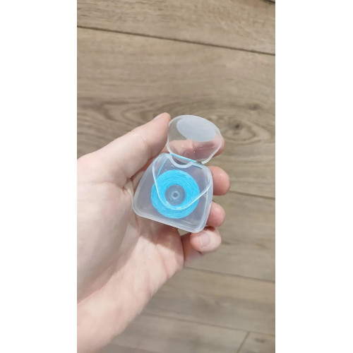 Удобный футляр,а так же система отреза нити.Сама нить крепкая,не рвется,удобно очищать зубы от остатков пищи.Аромат кокоса очень приятный и оставляет приятное послевкусие